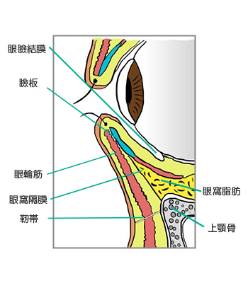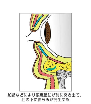 手術の適応となりやすいのは、主に1)の脂肪突出によるタイプです。下まぶた(下眼瞼)では、眼球を支える靭帯がゆるむと、クッション役の眼窩脂肪が前方へ押し出され、膨らみとたるみが目立ちます。引き伸ばされた皮膚はさらに弛みを助長します。